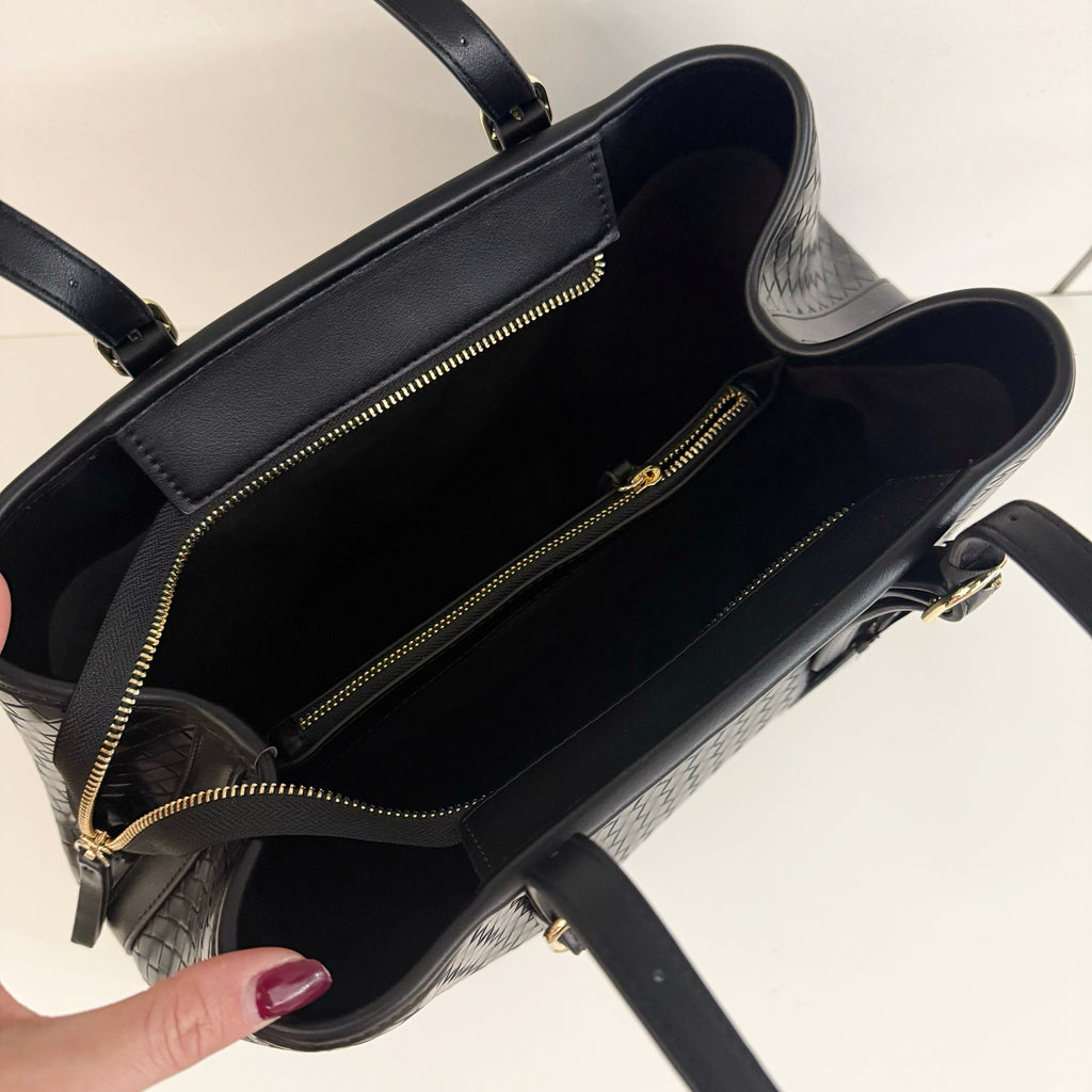 Realizzata in similpelle con stampa effetto intrecciato, si distingue per la texture raffinata e la linea morbida.,