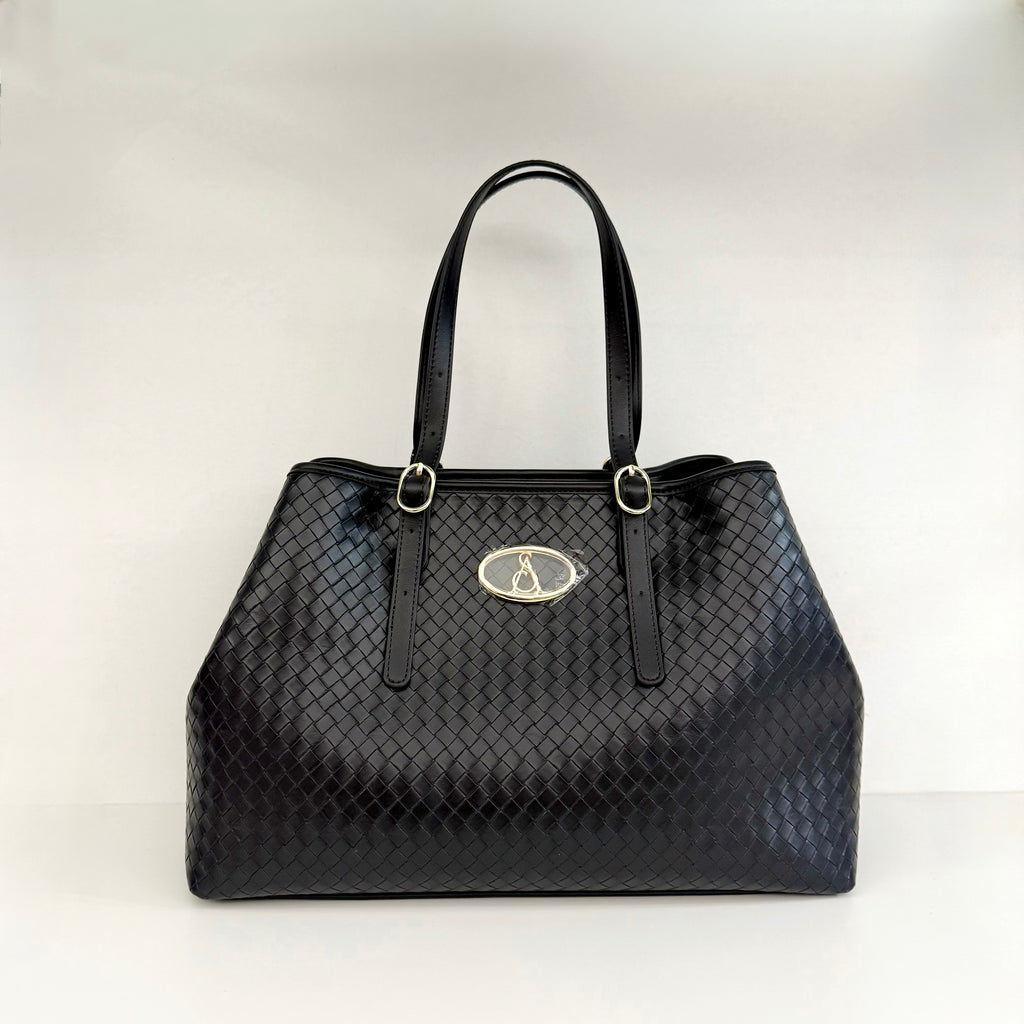 Una shopper moderna dalla silhouette compatta ma capiente, con dettagli metallici discreti e finiture curate.