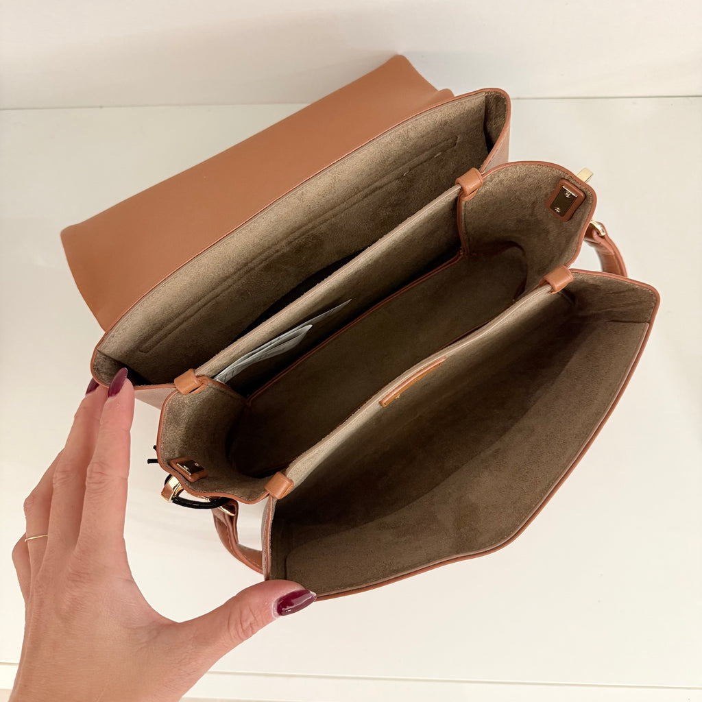 L’interno, non foderato, ma è suddiviso in tre pratici scomparti che permettono di organizzare con ordine tutto l’essenziale.