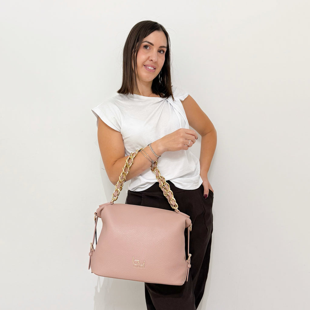 È realizzata in similpelle martellata e la sua forma è morbida e capiente con chiusura a zip e interno foderato, completato da una tasca interna. È inoltre dotata di una tracolla removibile e regolabile per l’utilizzo a spalla o cross‑body.