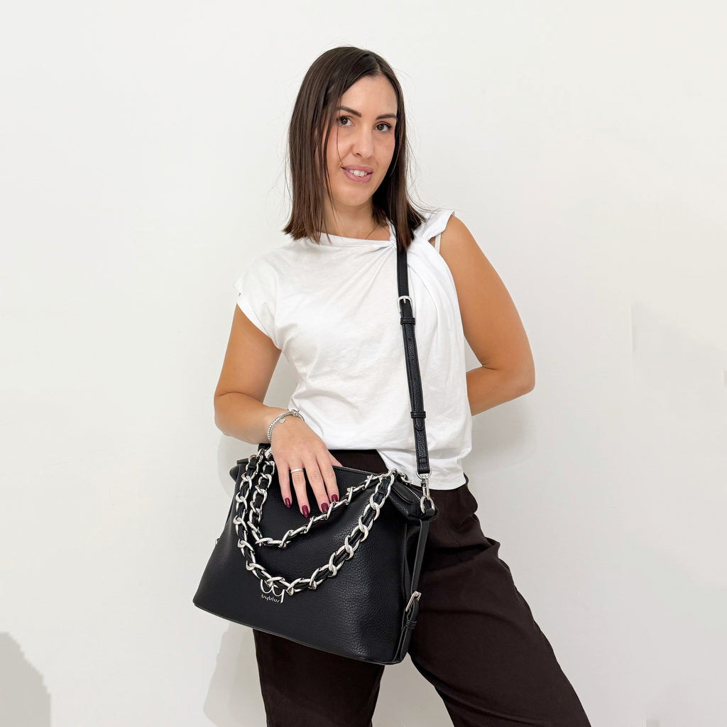È realizzata in similpelle martellata e la sua forma è morbida e capiente con chiusura a zip e interno foderato, completato da una tasca interna. È inoltre dotata di una tracolla removibile e regolabile per l’utilizzo a spalla o cross‑body.