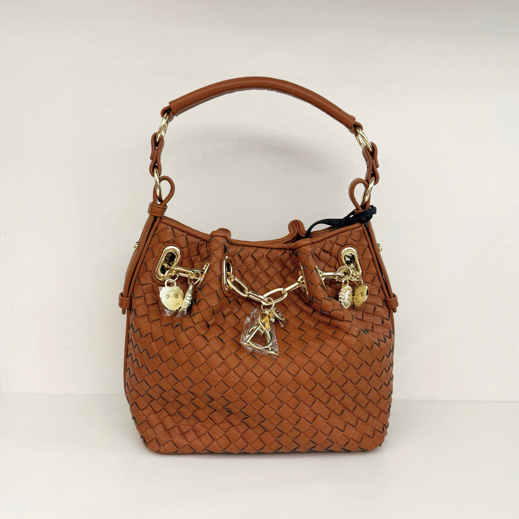 I dettagli metallici dorati e la catena con piccoli charms decorativi completano il design, donando luminosità e carattere alla borsa.