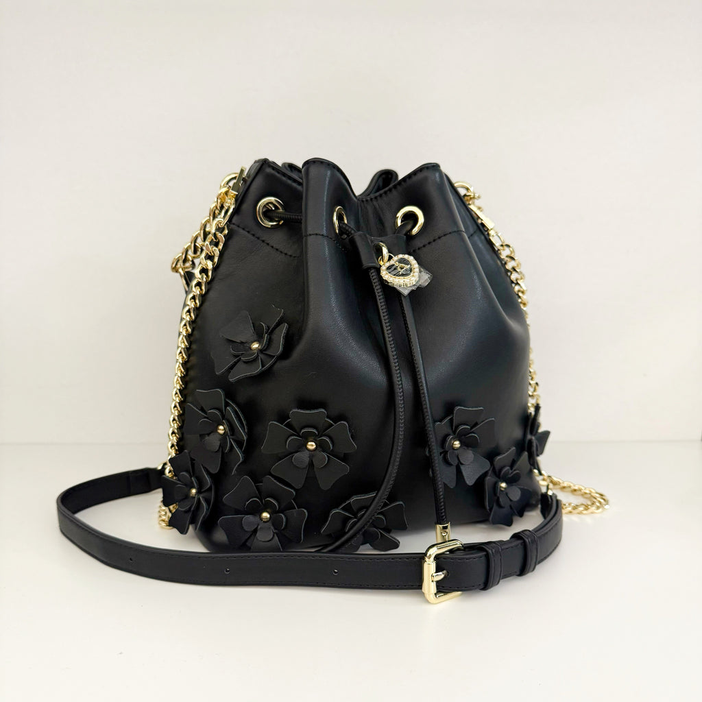 Borsa a secchiello con applicazione di fiori in rilievo.