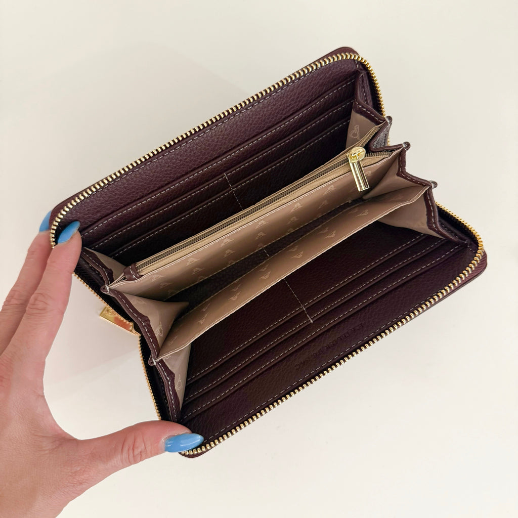 Interno ampio e spazioso diviso in quattro scomparti per banconote, ricevute, documenti e portamonete centrale con zip, rivestito con fodera logata.