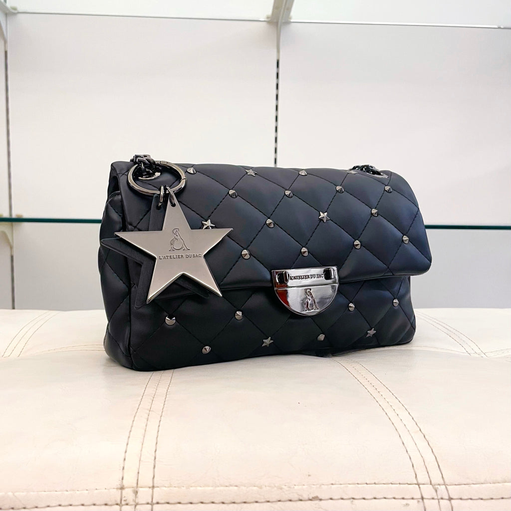Borsa in tessuto matelassé caratterizzato da impunture con borchie e stelle, si apre con patta e bottone e all'interno è suddivisa in due scoparti.