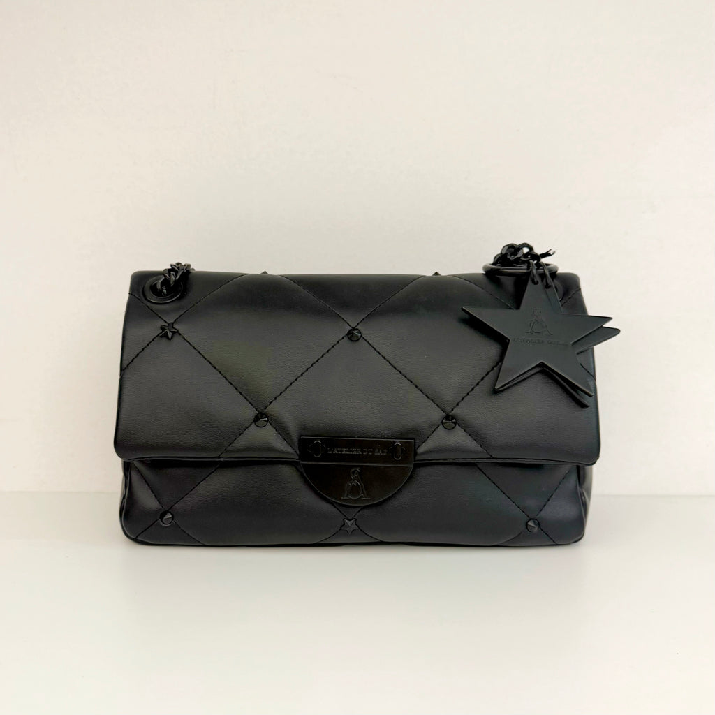 Borsa in tessuto matelassé caratterizzato da impunture con borchie e stelle, si apre con patta e bottone e all'interno è suddivisa in due scoparti.