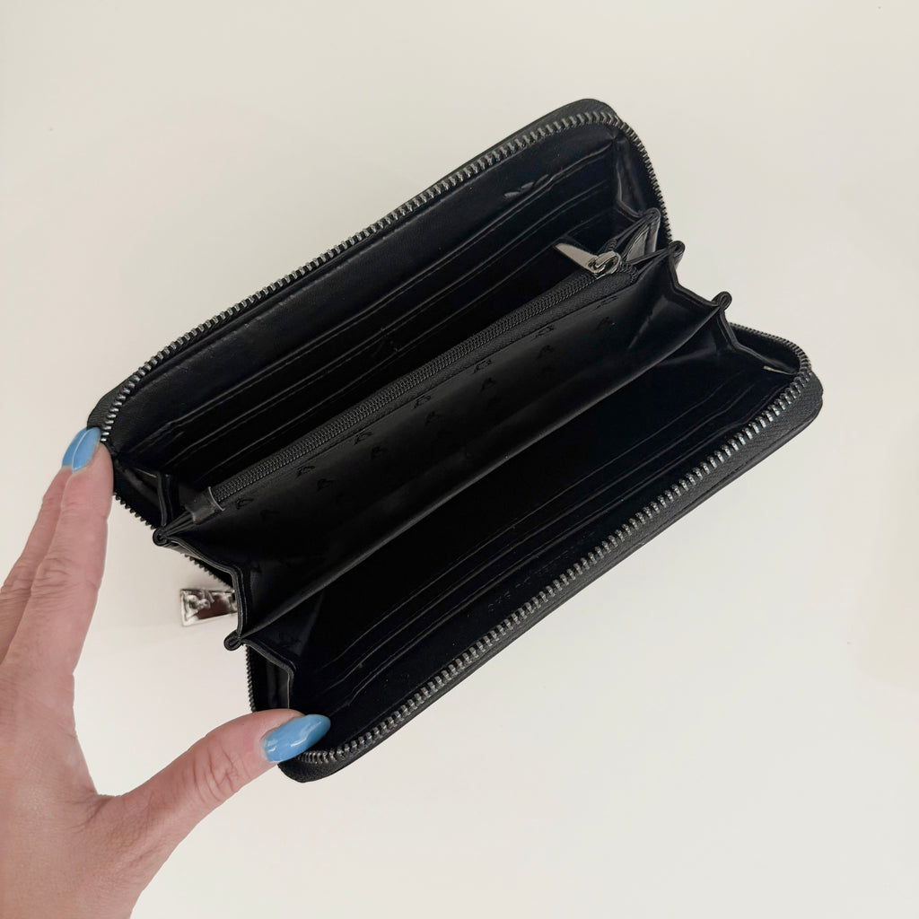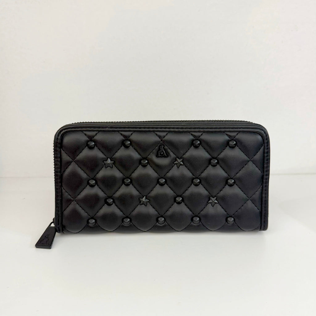 Portafoglio zip around realizzato in similpelle trapuntata nera con micro borchie.