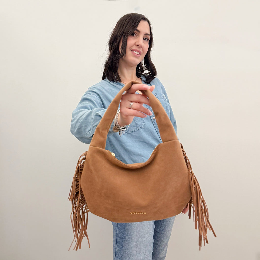 Realizzata in similpelle effetto camoscio racchiude tutta la personalità dello stile boho in un formato ridotto e super versatile.